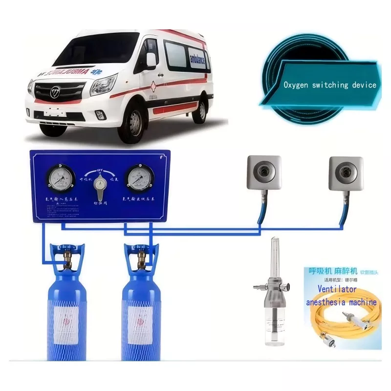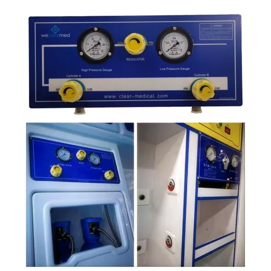 该救护车医用气歧管单元适用于氧气消耗量高的救护车。它通过金属软管将瓶装的高压氧瓶装到控制面板主管道上,然后将高压氧气通过降压后通过低压管道传递到氧气末端,以用作氧气来源,以用作氧气来源。工作原理是将高压氧对低压进行解压缩,并通过各个管道将其输送到氧气末端,以提供氧气末端端口和呼吸机端口。控制面板可以同时连接到两个或多个氧气缸,以将瓶装的高压氧解压缩到一定压力,这是一种用于集中气体供应的设备。控制面板由由金属软管制成的高压管道组成,该管道通过G5/8螺纹连接到氧气缸。每个氧气缸都用相应的高压开关阀连接到控制面板,该阀控制相应的高压管道。连接开关阀后端的每个氧气缸的高压管道相互连接,歧管配备了歧管中间的T恤连接器,以连接高压计,调节器和高压管道。高压计用于监测控制面板的高压管道中的氧气压力,并使用调节器将高压氧气调节至所需的压力,然后输出到低压端子。低压端连接到氧端子,安全阀和低压仪,用于监视控制面板低压管道中的压力,而当安全阀在输出压力高于设计压力时,安全阀会自动耗尽气体,以确保输出压力的安全性和稳定性。该系统适用于需要气体收敛开关以监视气压和气体剩余数量的任何地方,例如:医院,救护车,石油,液化石油站以及其他工业和采矿企业和机构。