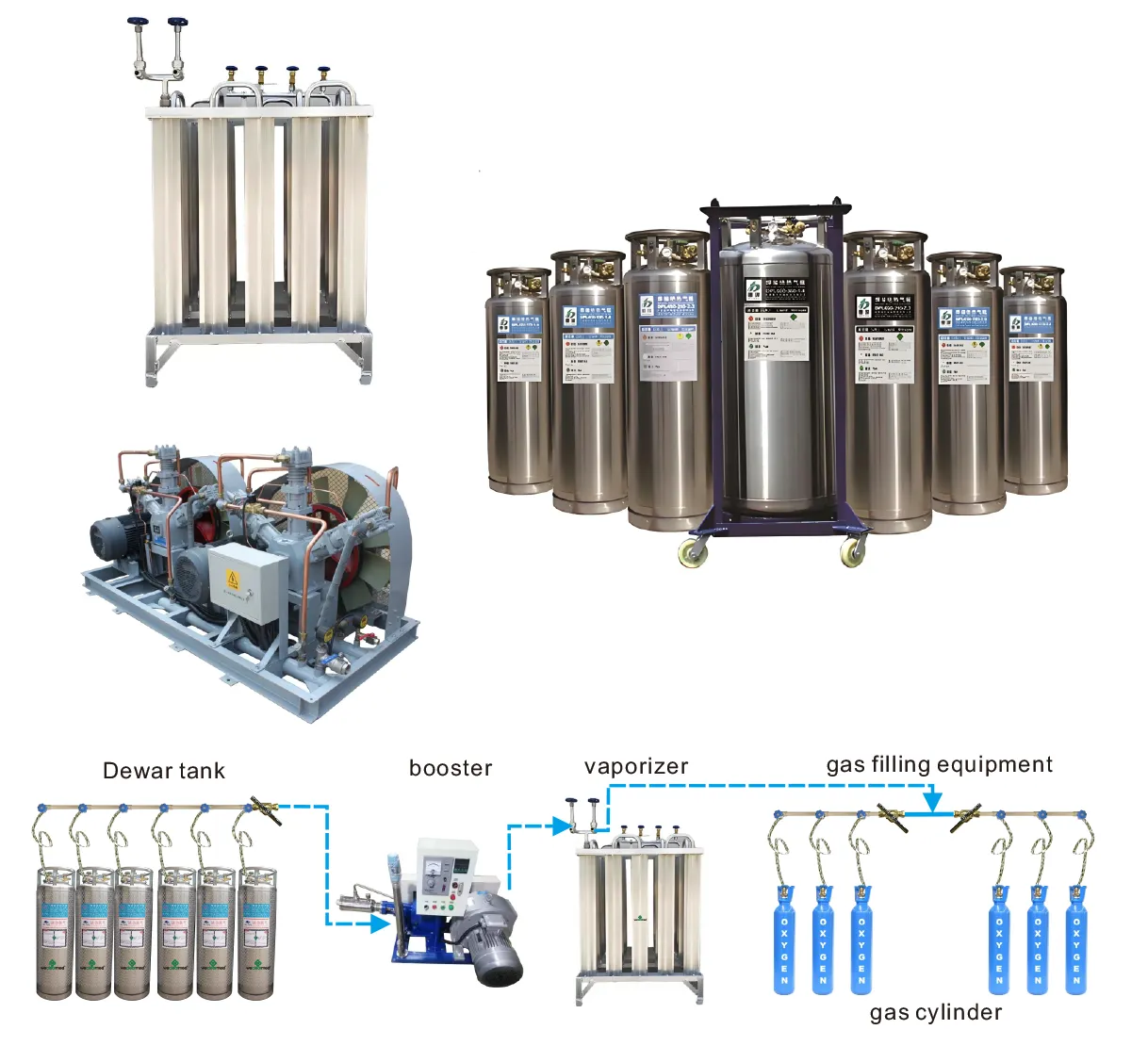 汇总的低温液体氧气储存系统包括低温液体氧气罐,低温液体填充气缸泵,蒸发器,气压调节装置和填充歧管。
